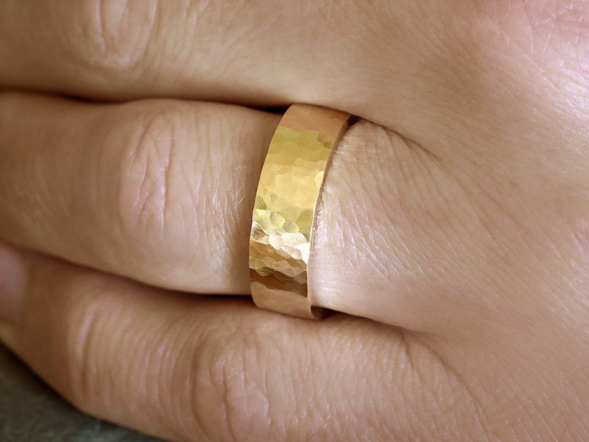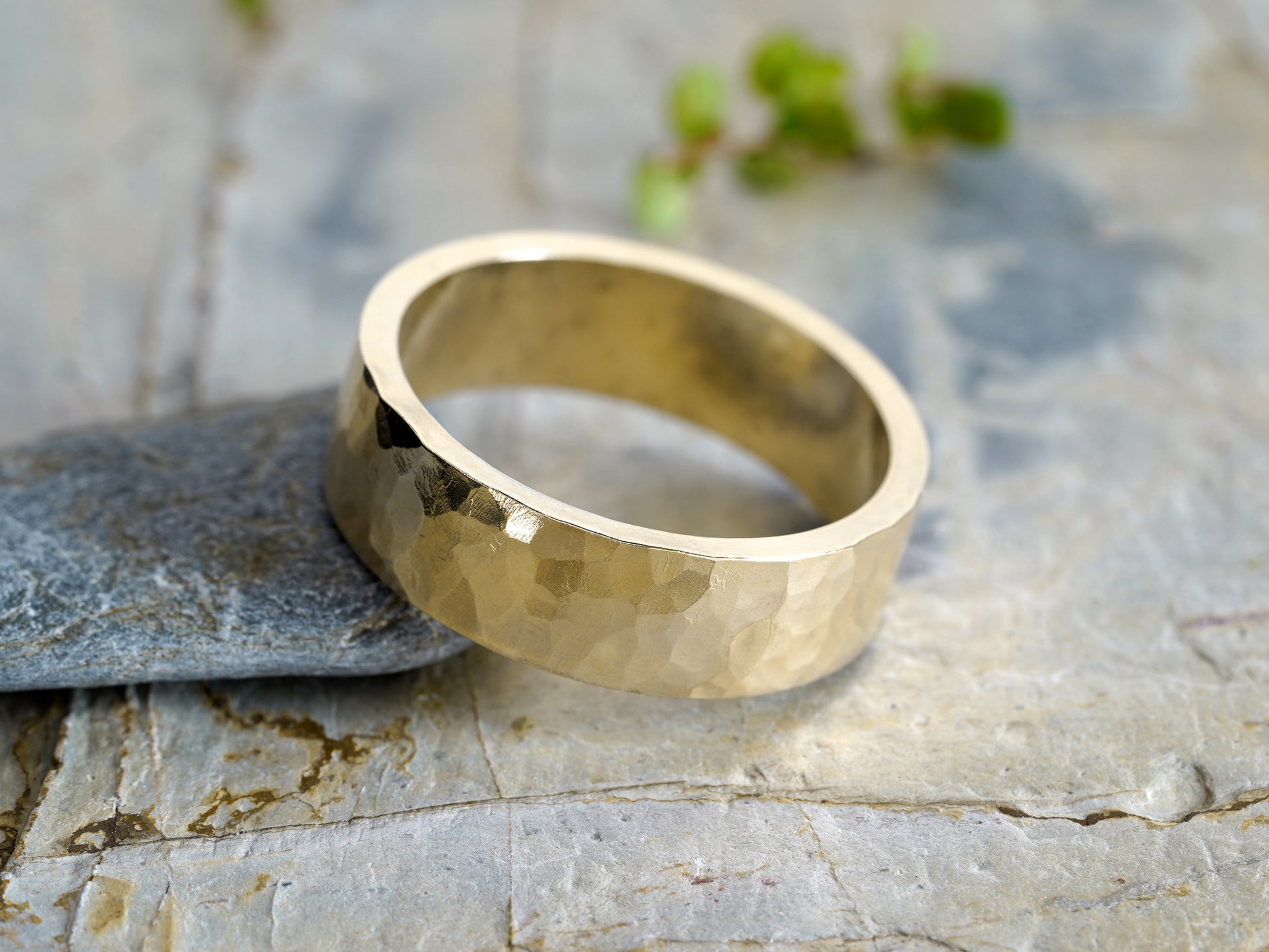 This 5mm hammered effect wedding band in yellow gold is handmade in our studio in the UK. This ring is made to order.