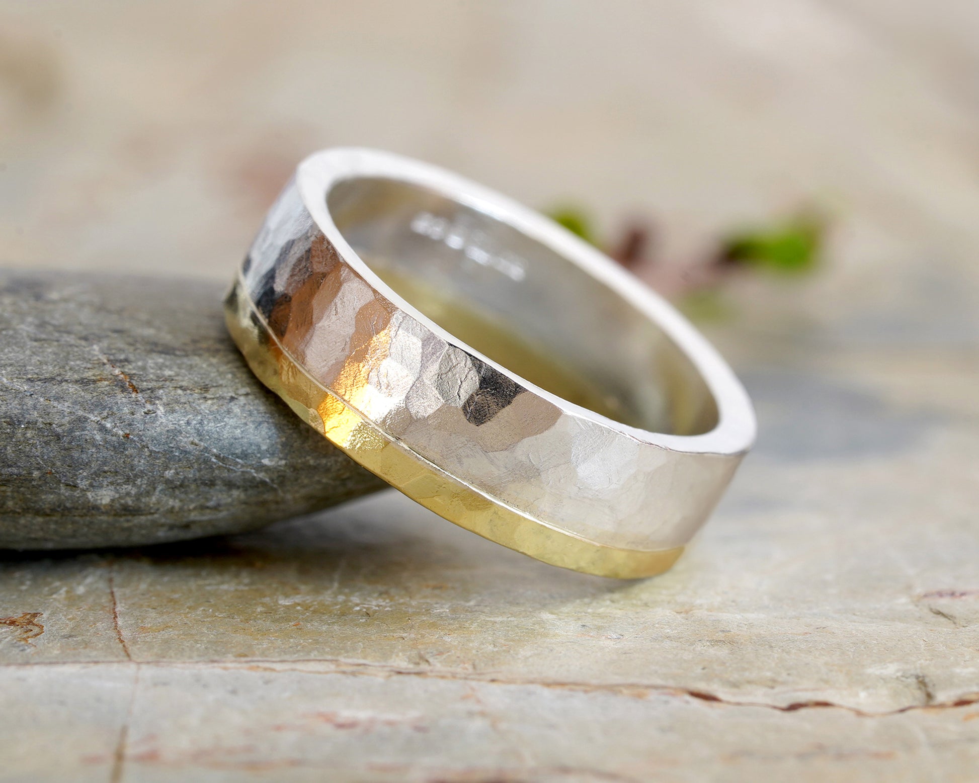 This hammered effect weding band in 18ct yellow gold and sterling silver is handmade in our studio in the UK. This ring is made to order.
