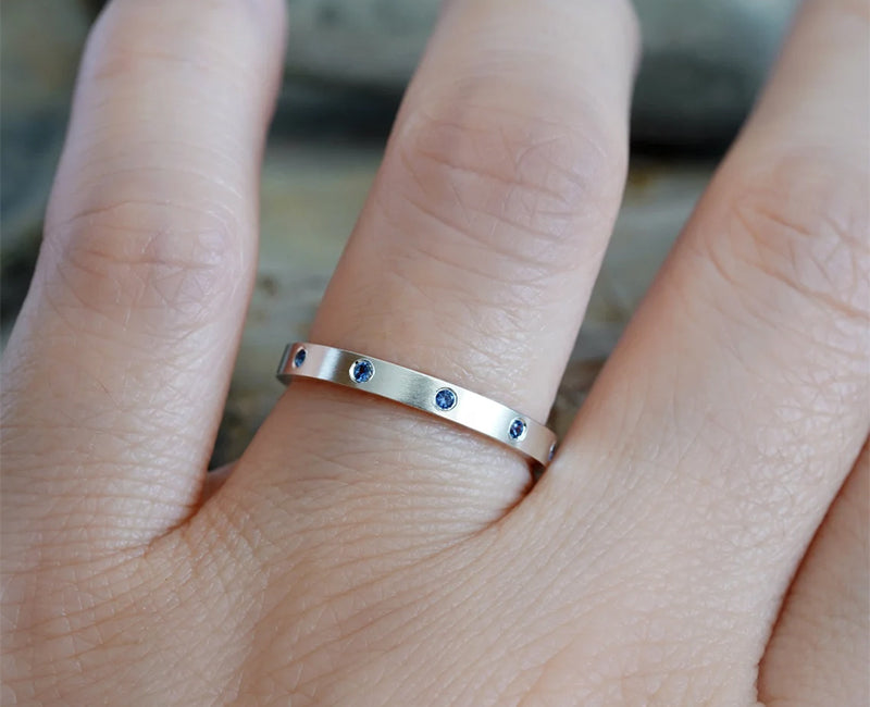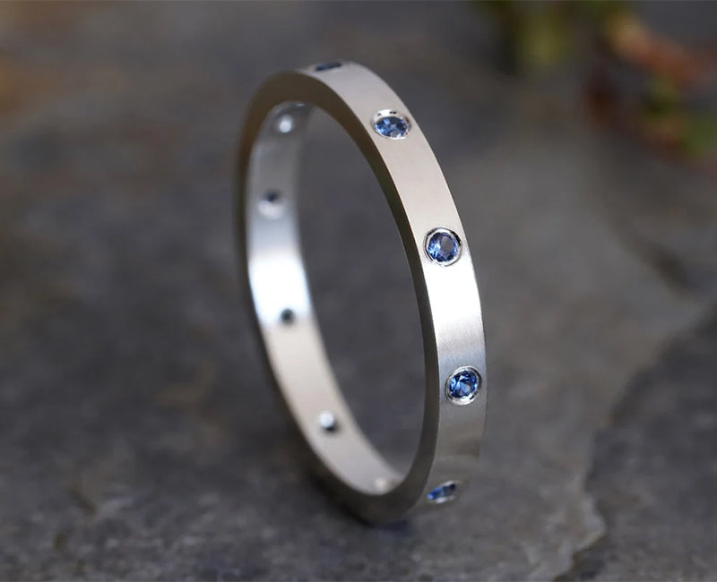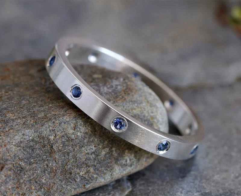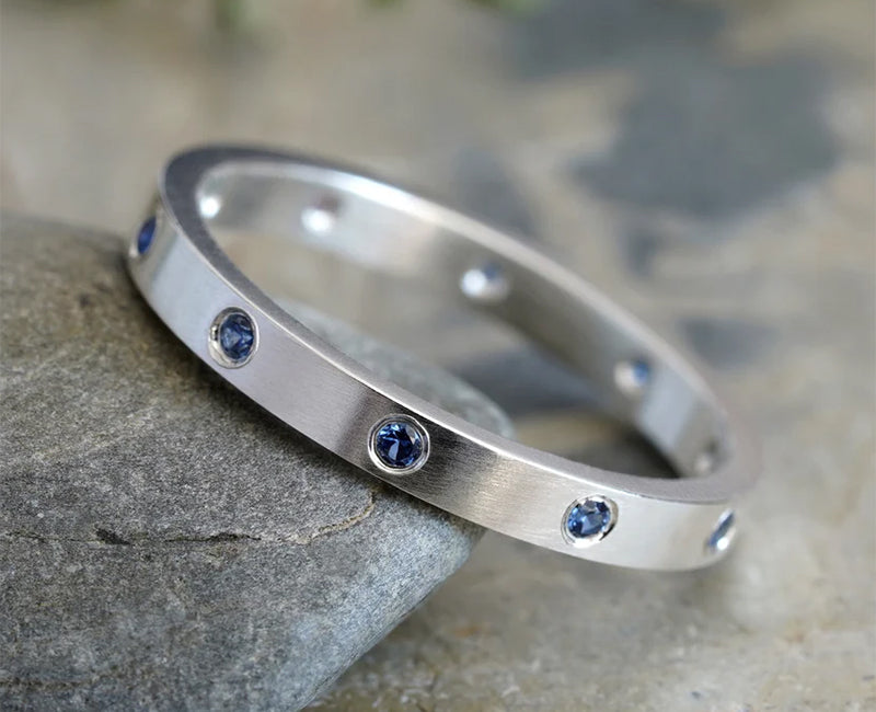 This sapphire eternity ring features 10 sapphires around the band. It's handmade at my studio in Cornwall, UK.