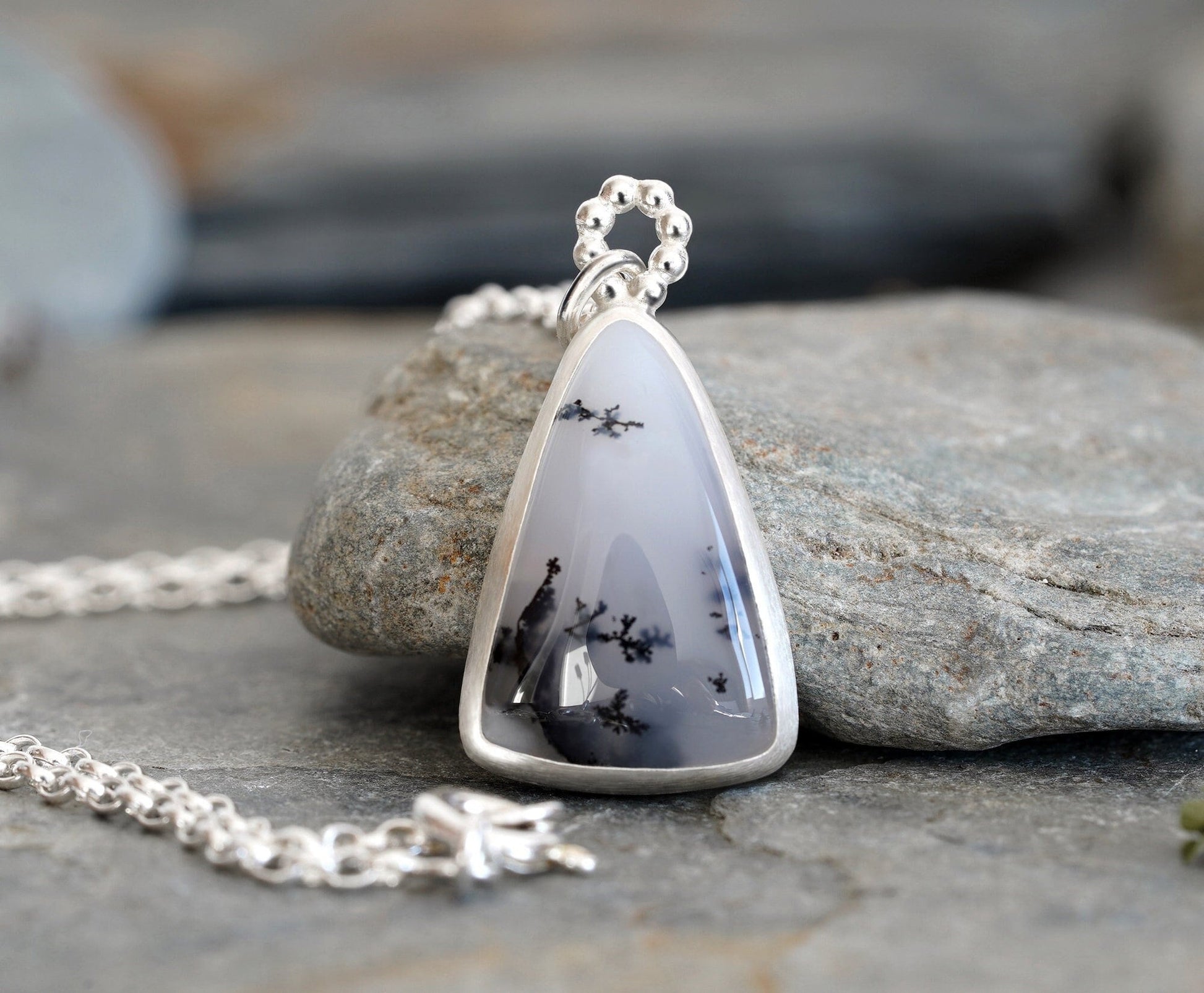 This triangular dendritic agate necklace is handmade at my studio in the UK and is ready to ship.