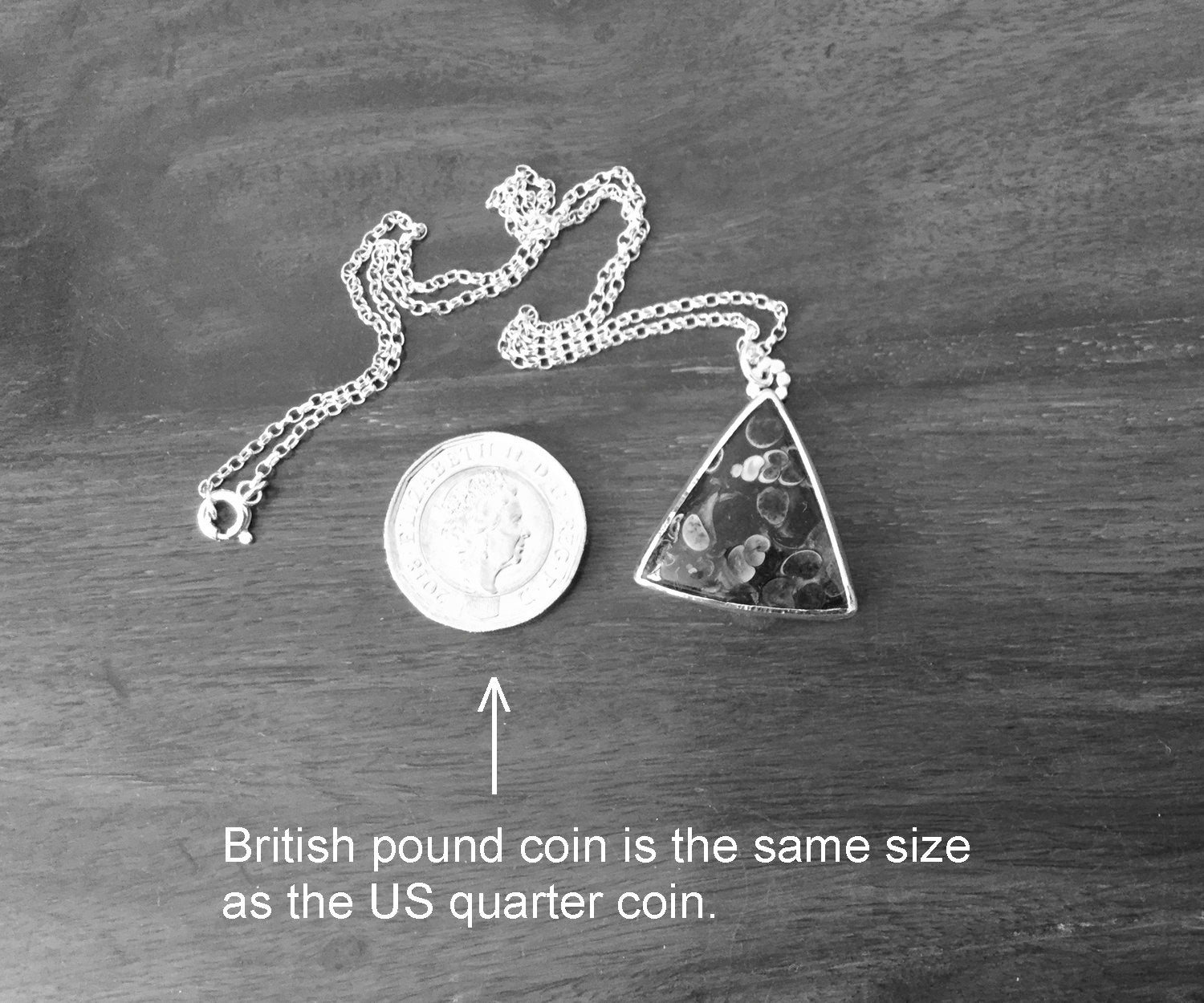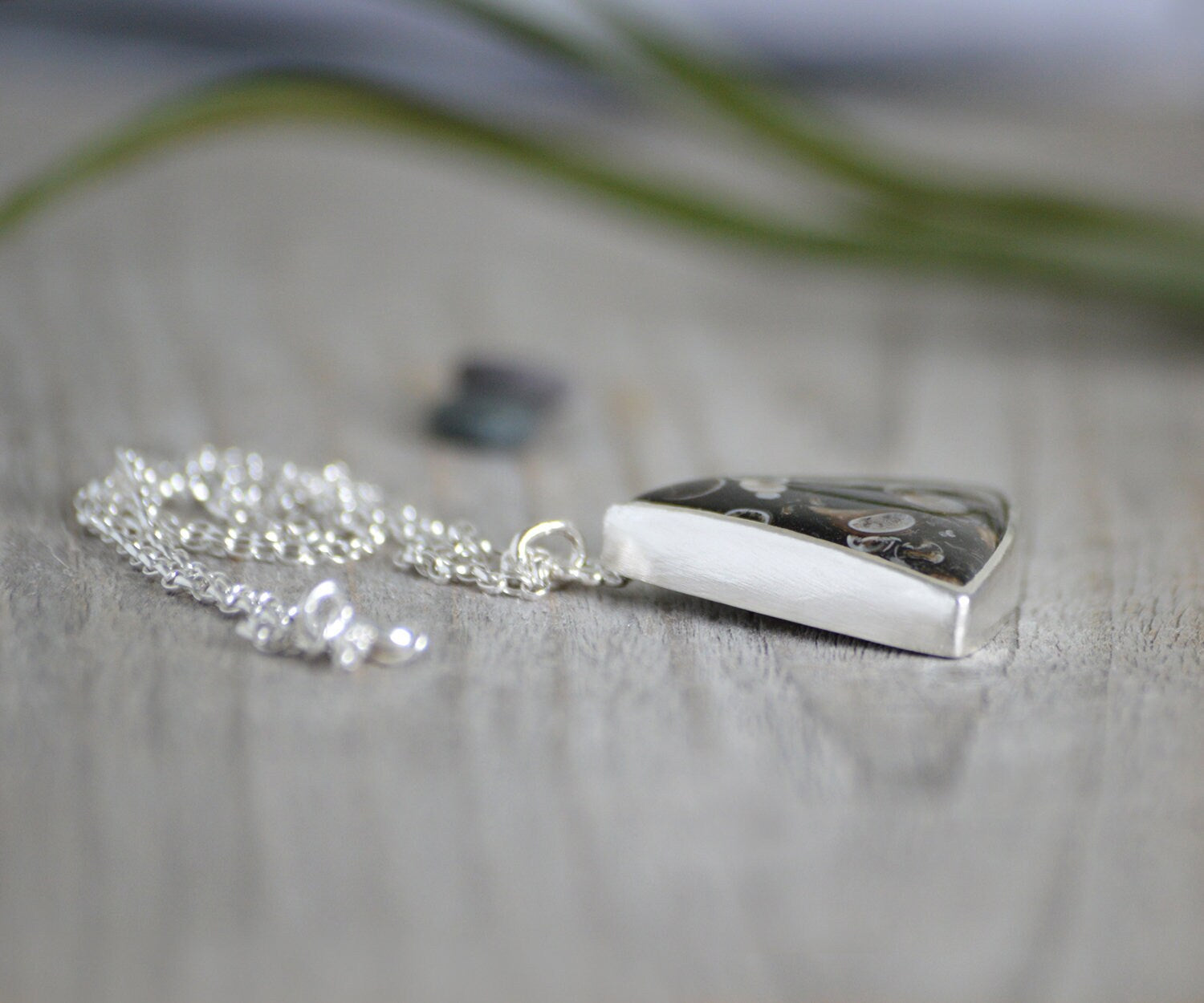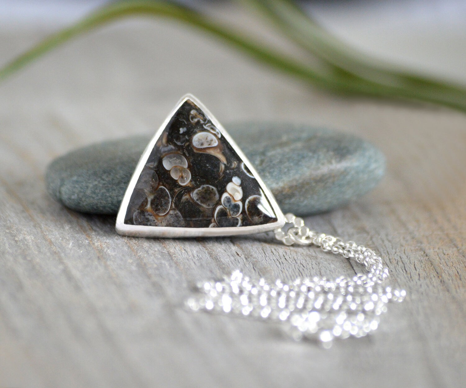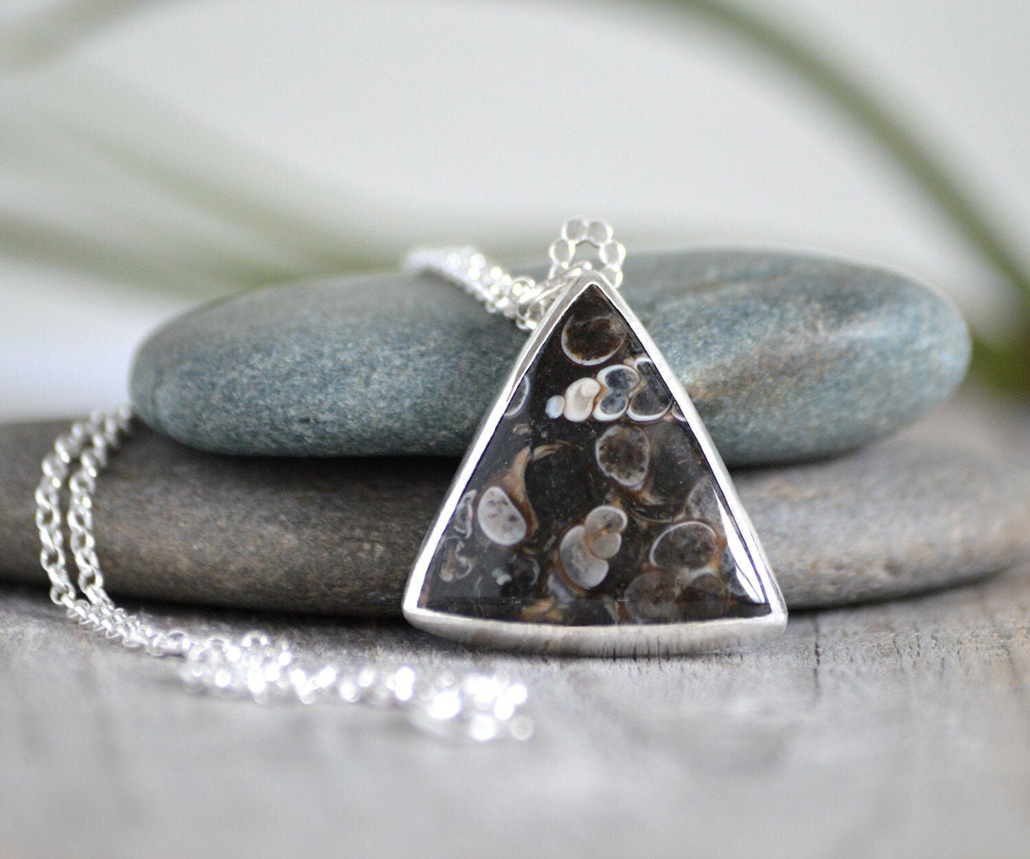 This triangular turritella agate necklace is handmade at my studio in the UK. It's one-of-a-kind and is ready to ship. Only one necklace is available.